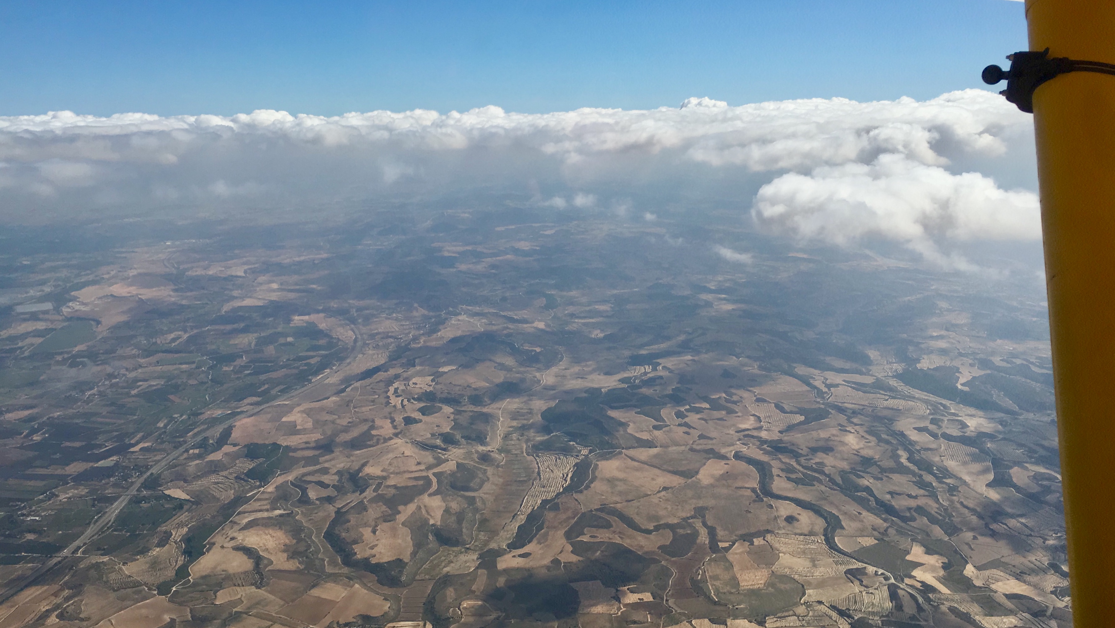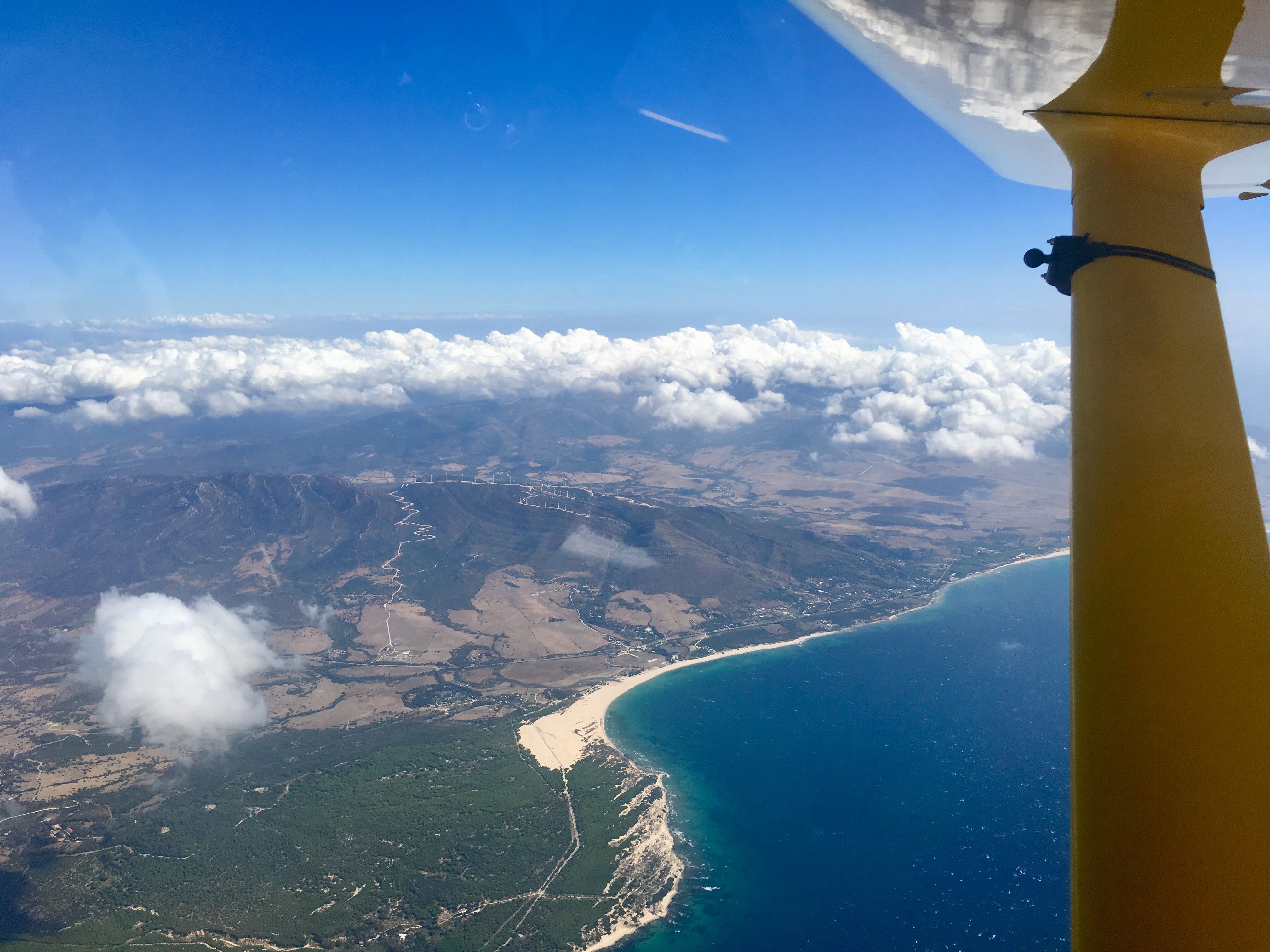 Jetzt wird es spannend. Wir sind über Tanger. Der Wind nimmt spürbar zu. Es fängt an zu wackeln. Gischt ist auf dem Meer zu sehen. In unserer Höhe ist es ein problemloser Überflug. Die Wackelei hält sich in Grenzen, wird erst unangenehm als wir in Spanien sinken und in die Thermik kommen. Aber: Wir sind wieder in Europa!